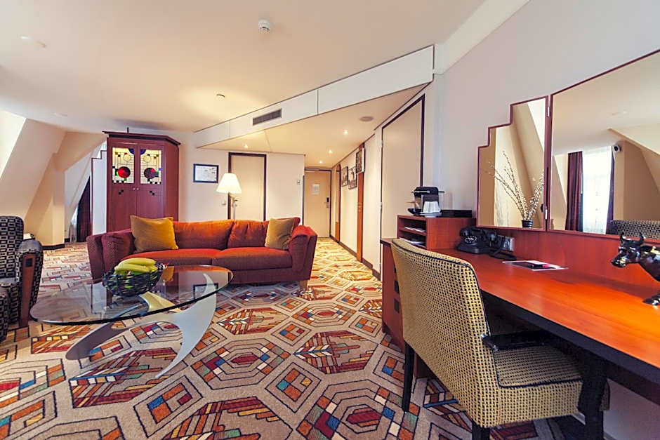 This Suite has a spacious living room and luxurious bathroom. It features a king-size bed, bathrobes & slippers, a seating area, Nespresso machine and Bluetooth Sound System.